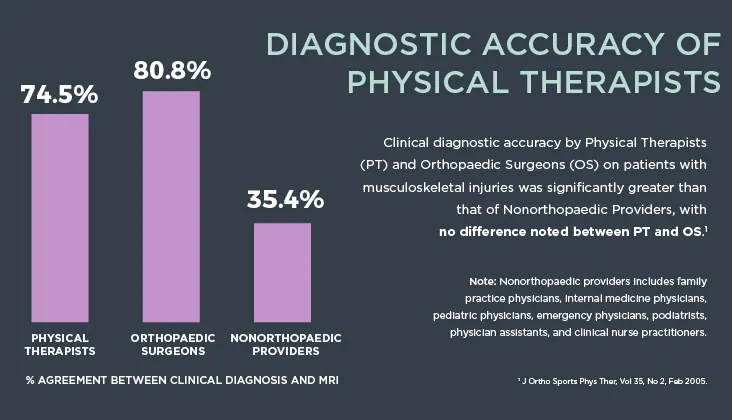 Clinical diagnostic accuracy by physical therapists and orthopaedic surgeons on patients with musculoskeletal injuries are statistically the same. Both provider types had significantly greater accuracy than that of non–orthopaedic providers. (As in, double the accuracy!)