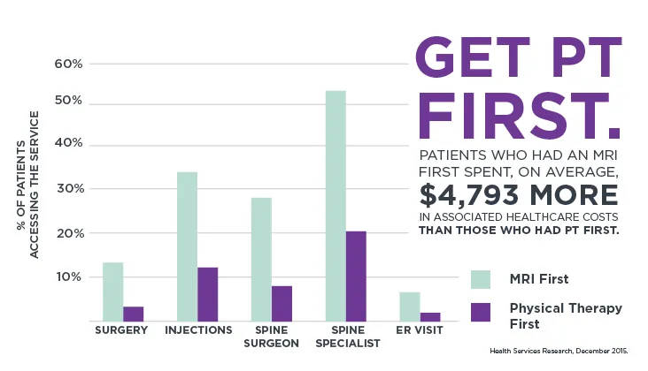 Lastly, a 2015 Health Services Research study found that the average cost of care was shown to be $4,793 more if a patient had an MRI first vs. seeing a physical therapist first. The study also shows the increased use of other services like additional diagnostic imaging and medication when the MRI is done prior to physical therapy.